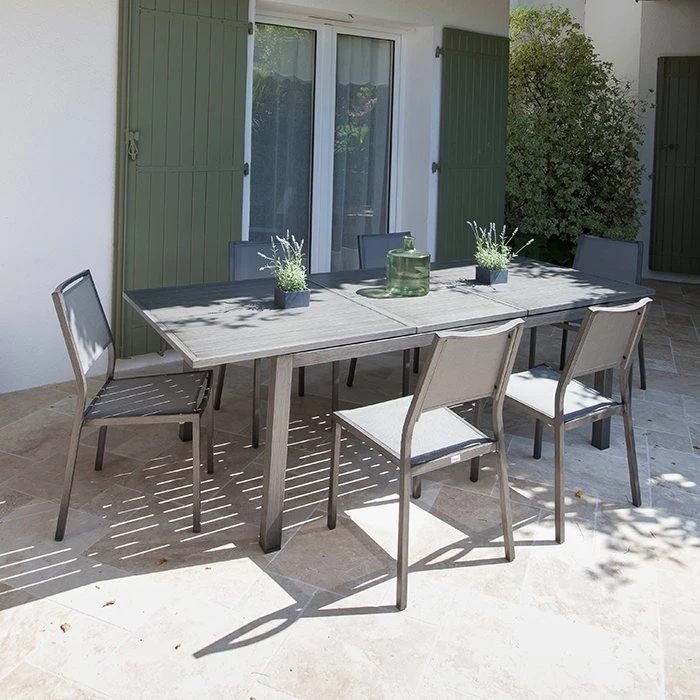 Leur structure en aluminium est très résistante et ne craint pas la corrosion. La peinture epoxy qui recouvre les chaises accroît encore plus leur résistance et protège des UV. La finition brush donne un aspect bois cérusé à la chaise.